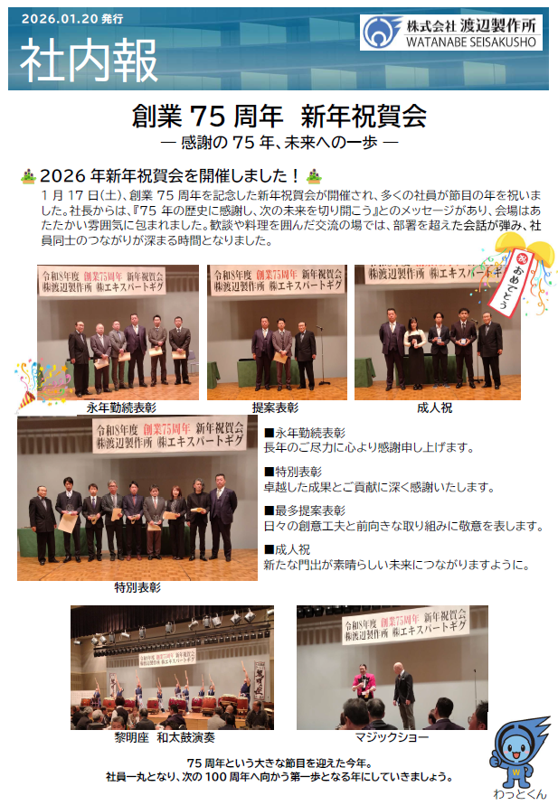 今回の号では、創業75周年を記念して開催された新年祝賀会の様子を掲載しています。